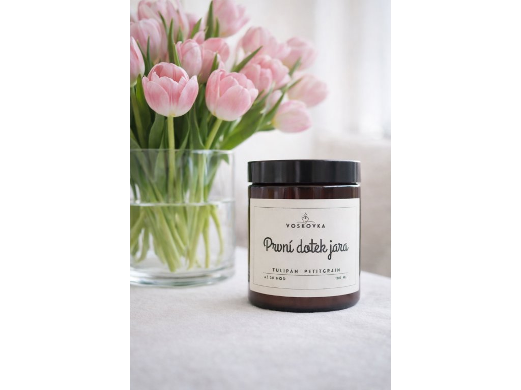 Sójový vosk + esenciální oleje (tulipán, petitgrain)
